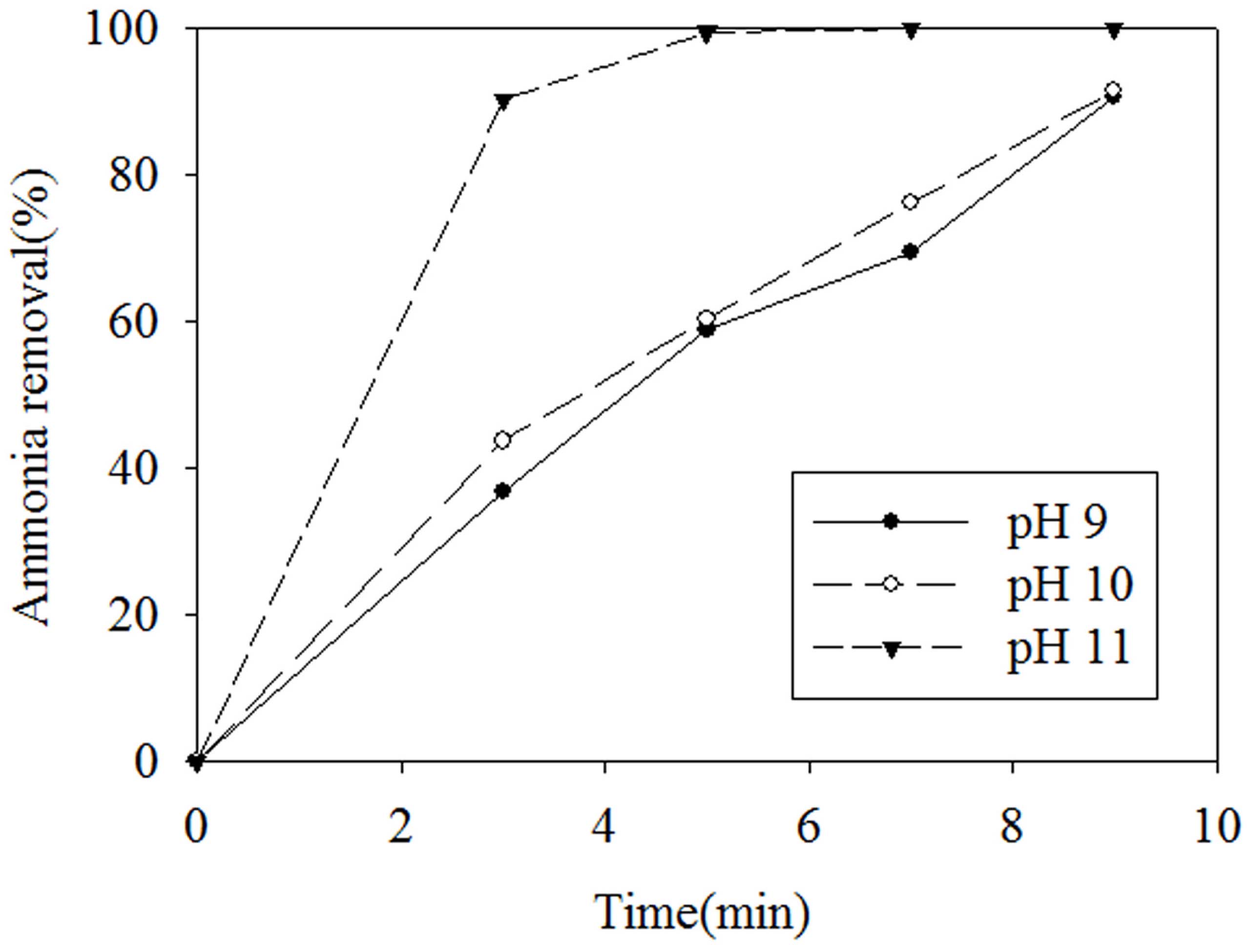 pH에 따른 암모니아성질소 제거효율(조건 : 0.9 L/min, 100°C, 1,600 W)은 pH 9 ~ 11범위에서 조사시간 경과(3 ~ 9분)