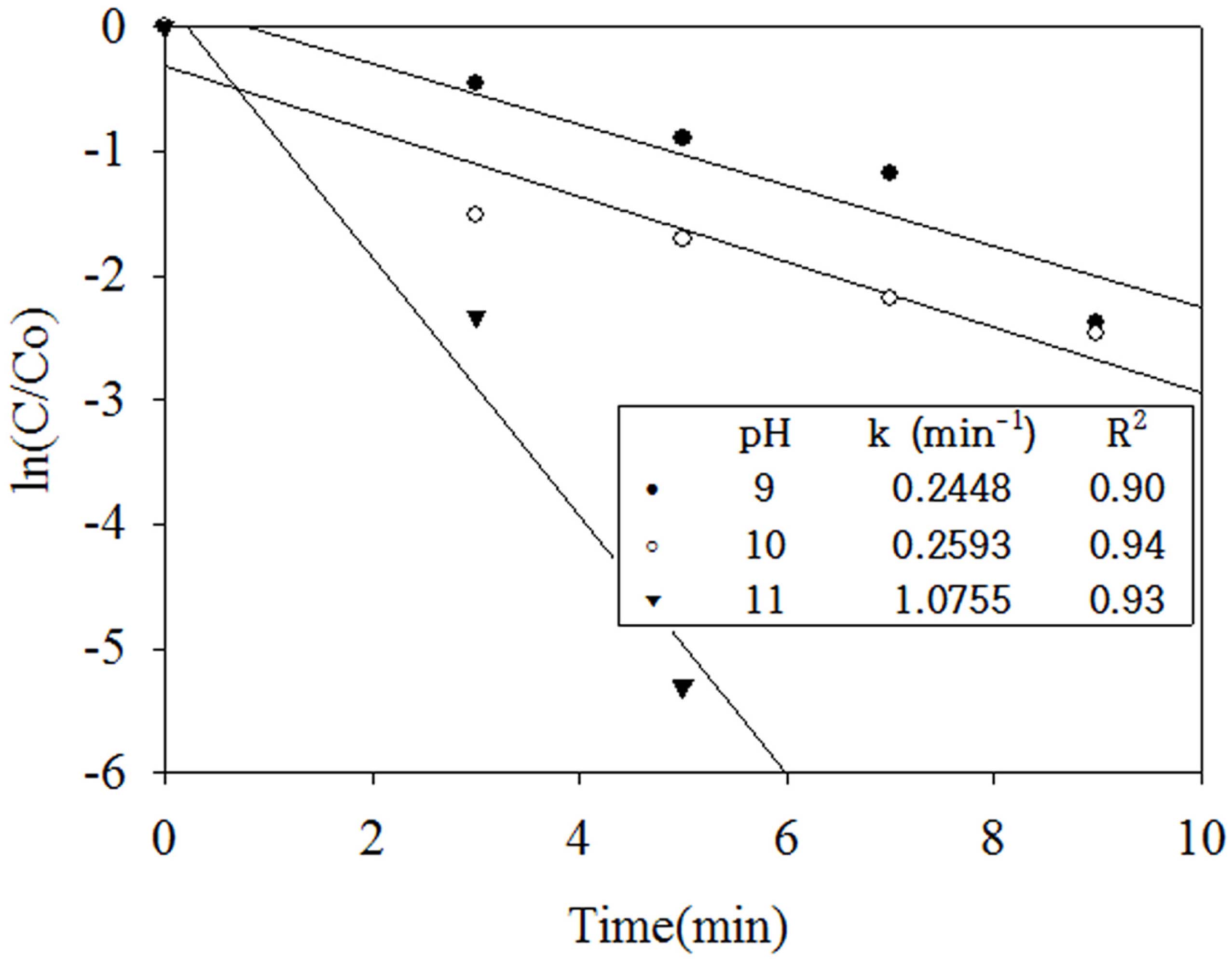 증가폭이 작았지만, pH 11로 증가하였을 때는 조사 시간 3분에서 50% 이상의 제거효율의 차이를 보였다. pH 9, 10의 경우 조사시간 9분에서