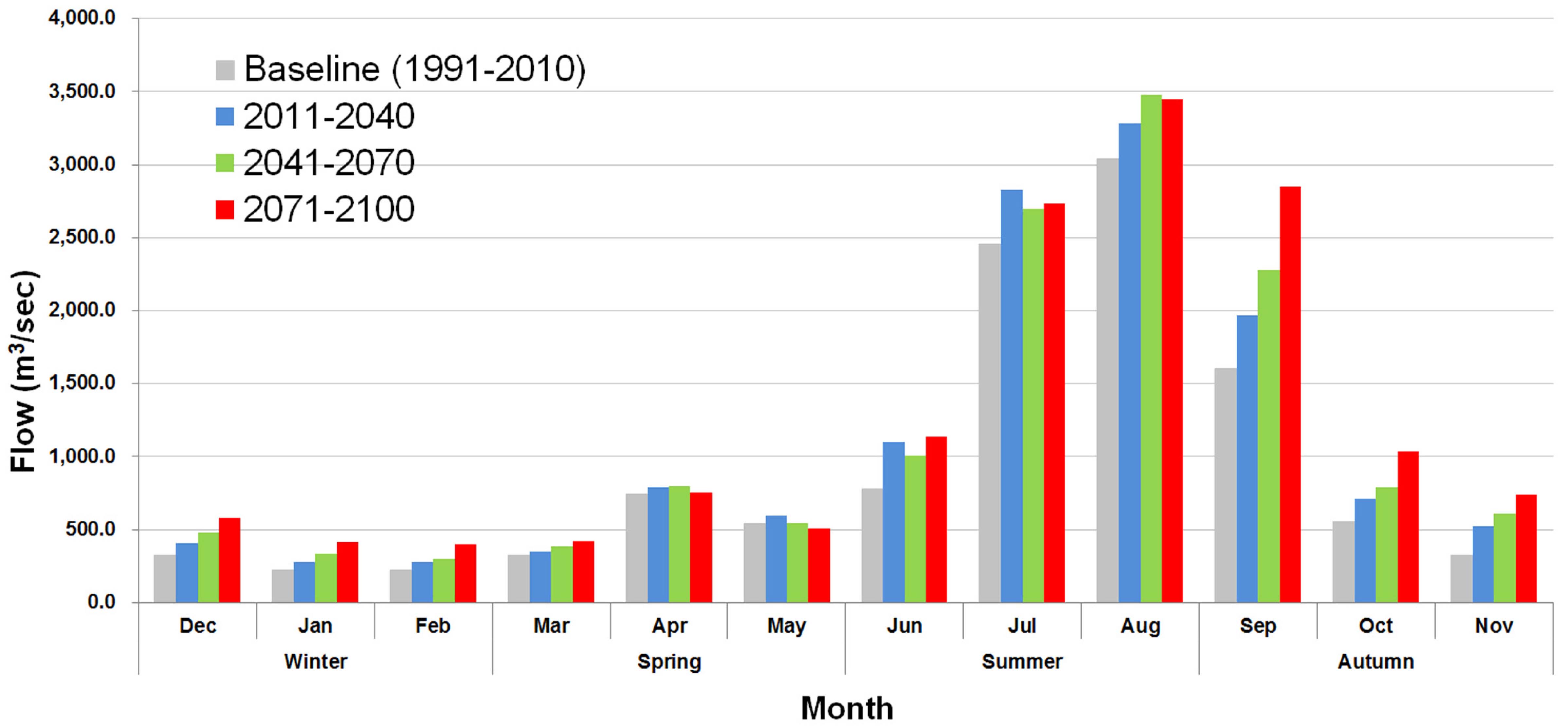 Fig. 11. Histogram of monthly dam inflows for the baseline and future periods.
