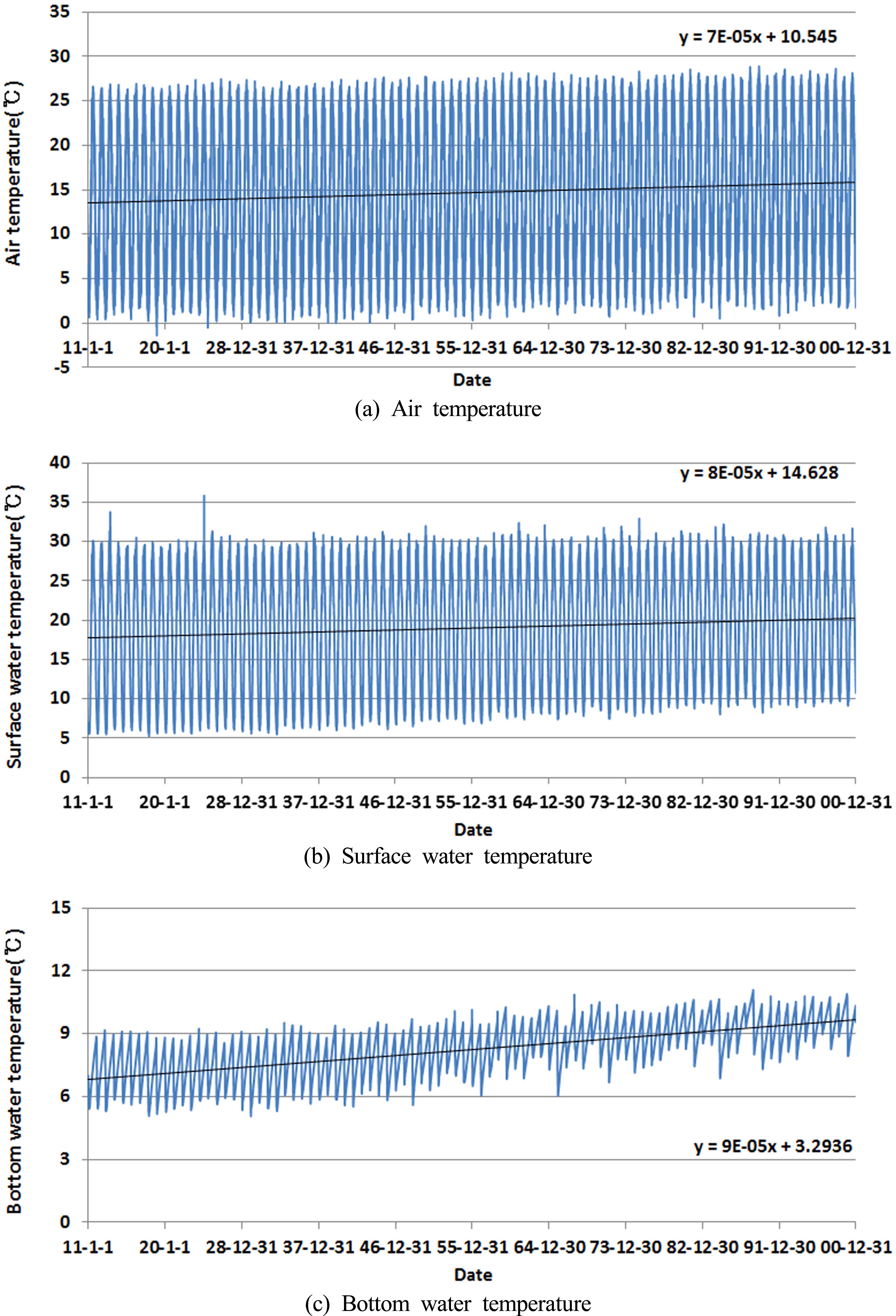 Fig. 13. Long term projection of air temperature, surface water temperature, bottom water temperature.