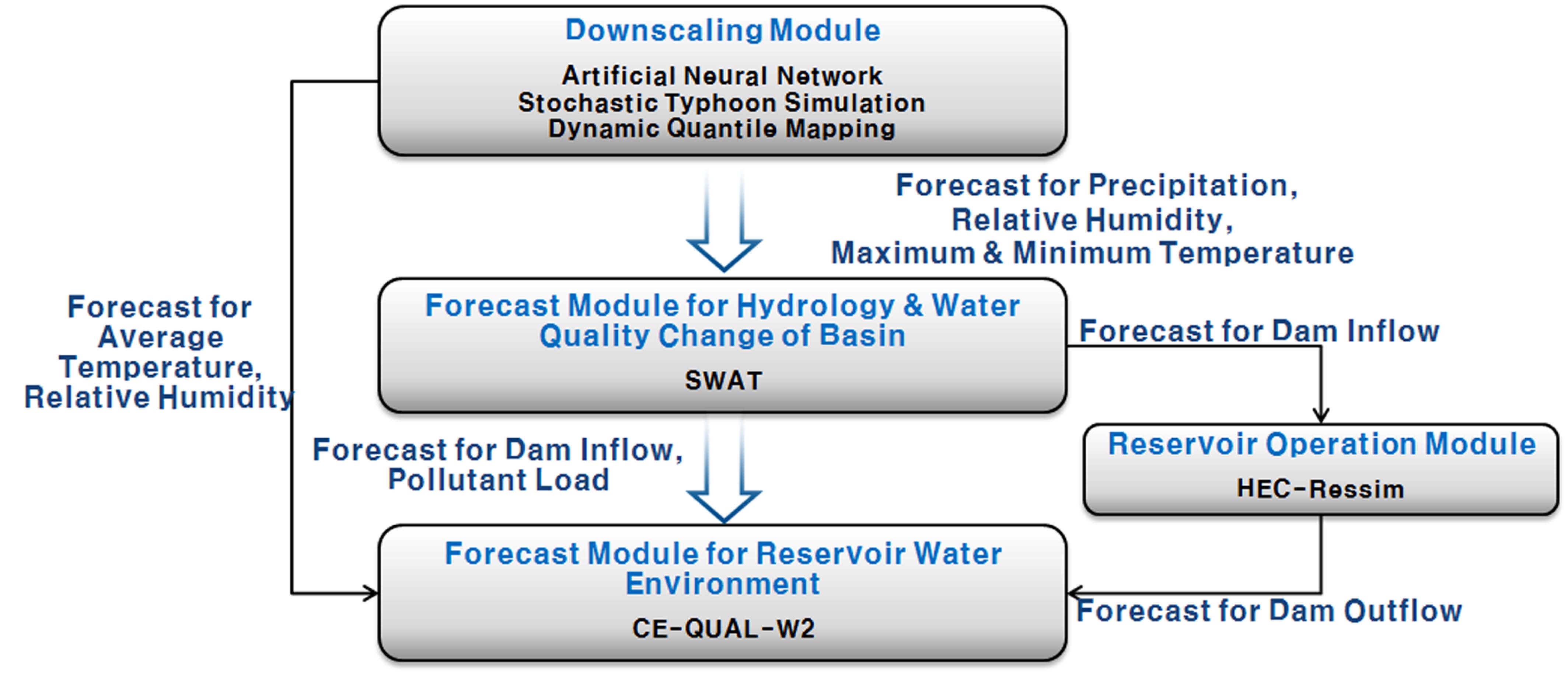 ๊ธฐํ์ ๋ง ์์ธํ๋ฅผ ์ํ ANN๊ธฐ๋ฒ, ์ ์ญ ์๋ฌธํ๊ฒฝ ๋ณํ๋ฅผ ๋ชจ์ํ ์ ์๋ SWAT, ์ ์์ง ์์จ์ฑ์ธต๊ตฌ์กฐ ํด์์ ์ํ CE-QUAL-W2๋ฅผ ์ด์ฉํ์ฌ