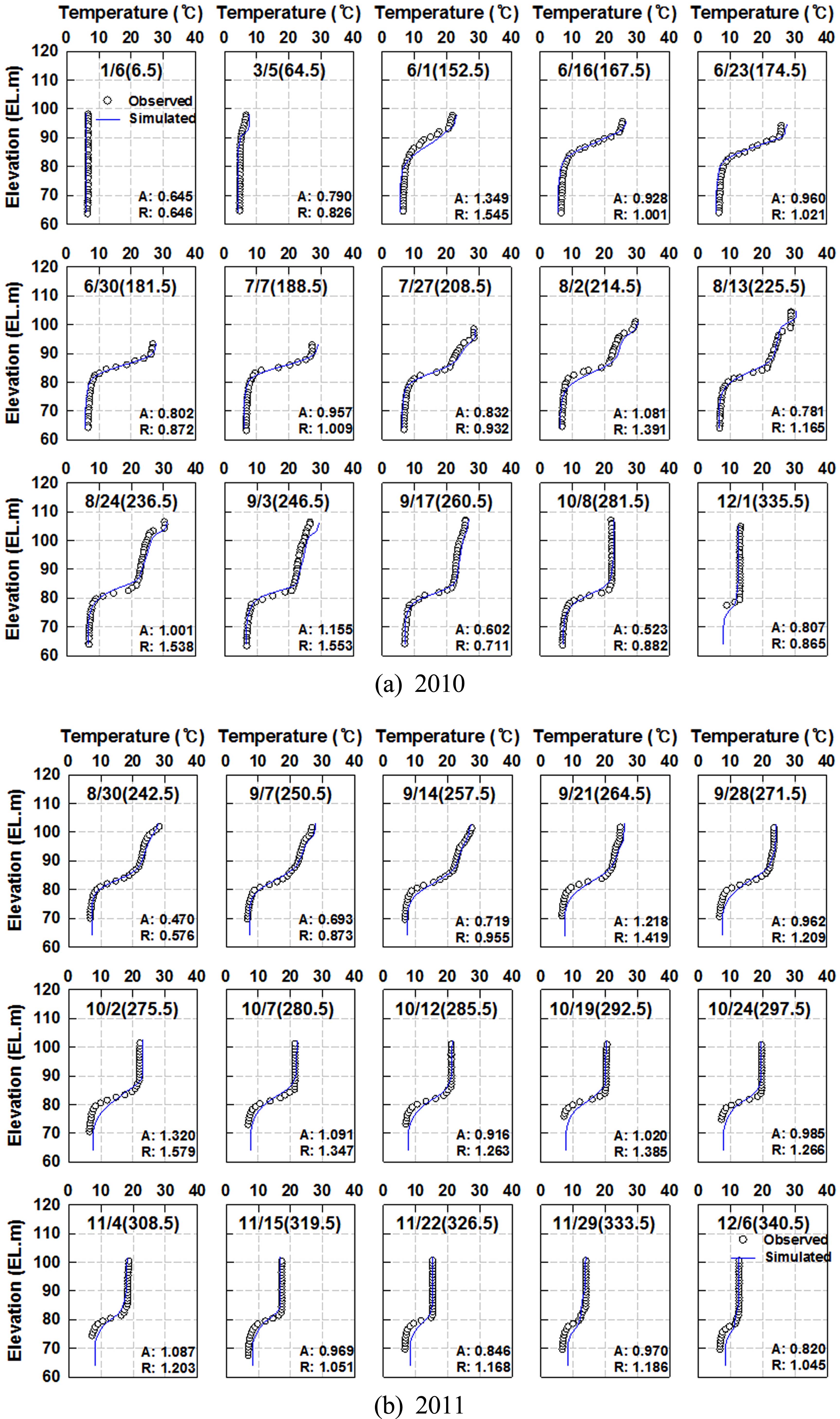 Fig. 9. Comparison of observed and simulated profile of water temperature at Juam 1 during calibration (a) and validation (b) periods.