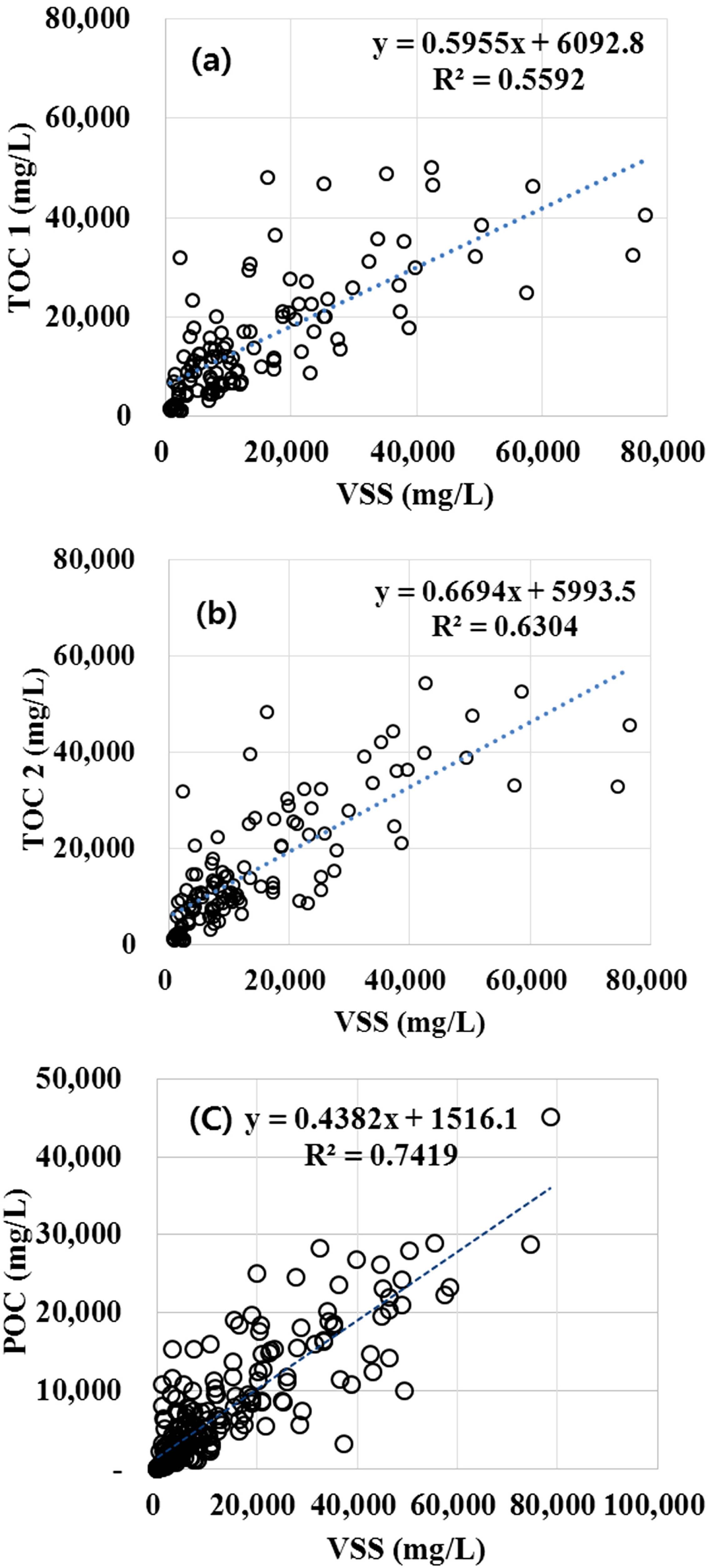 Fig. 2. Correlation of TOC 1 (a), TOC 2 (b), POC (c) and VSS.