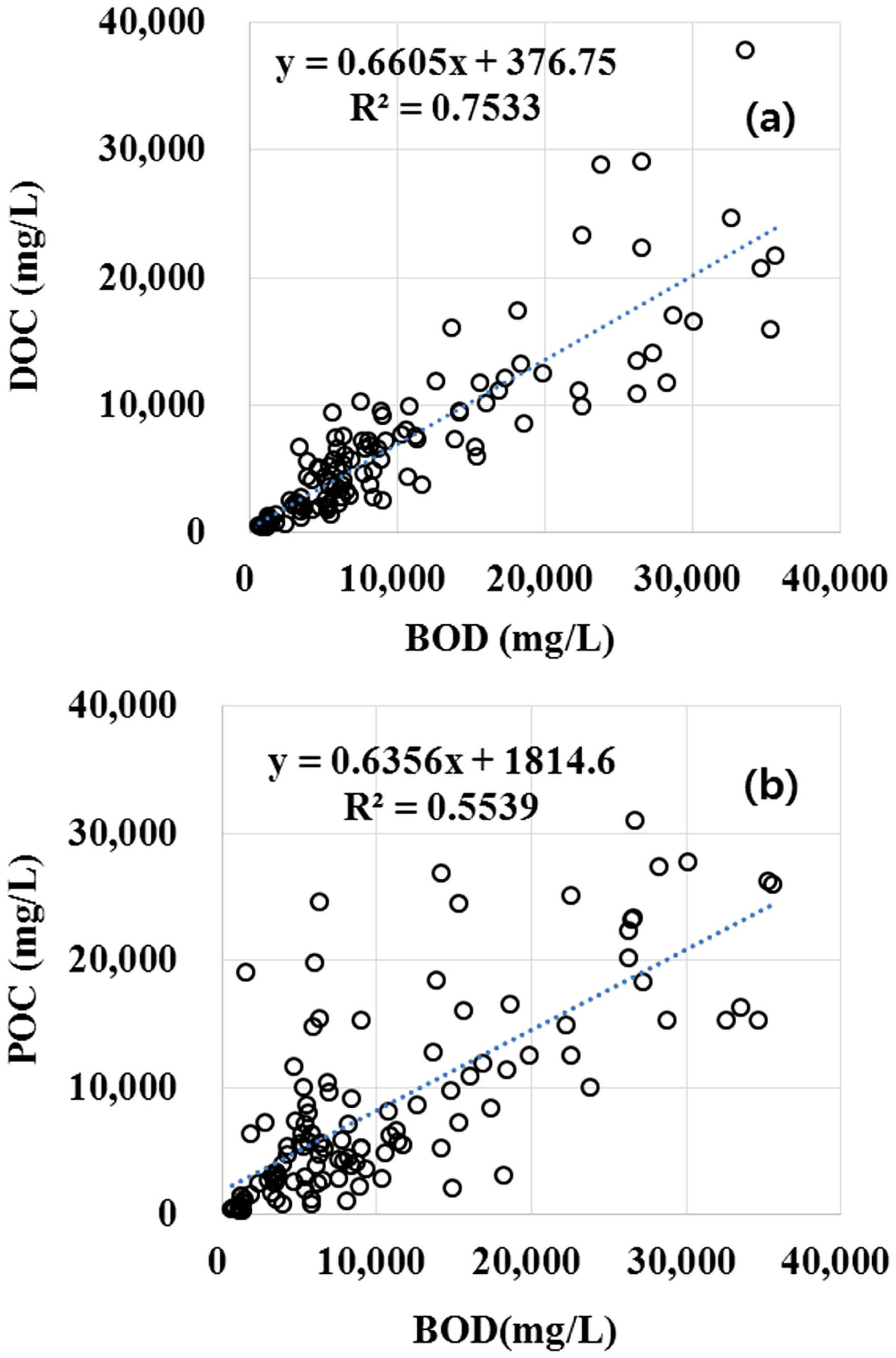 Fig. 3. Correlation of DOC (a), POC (b) and BOD.