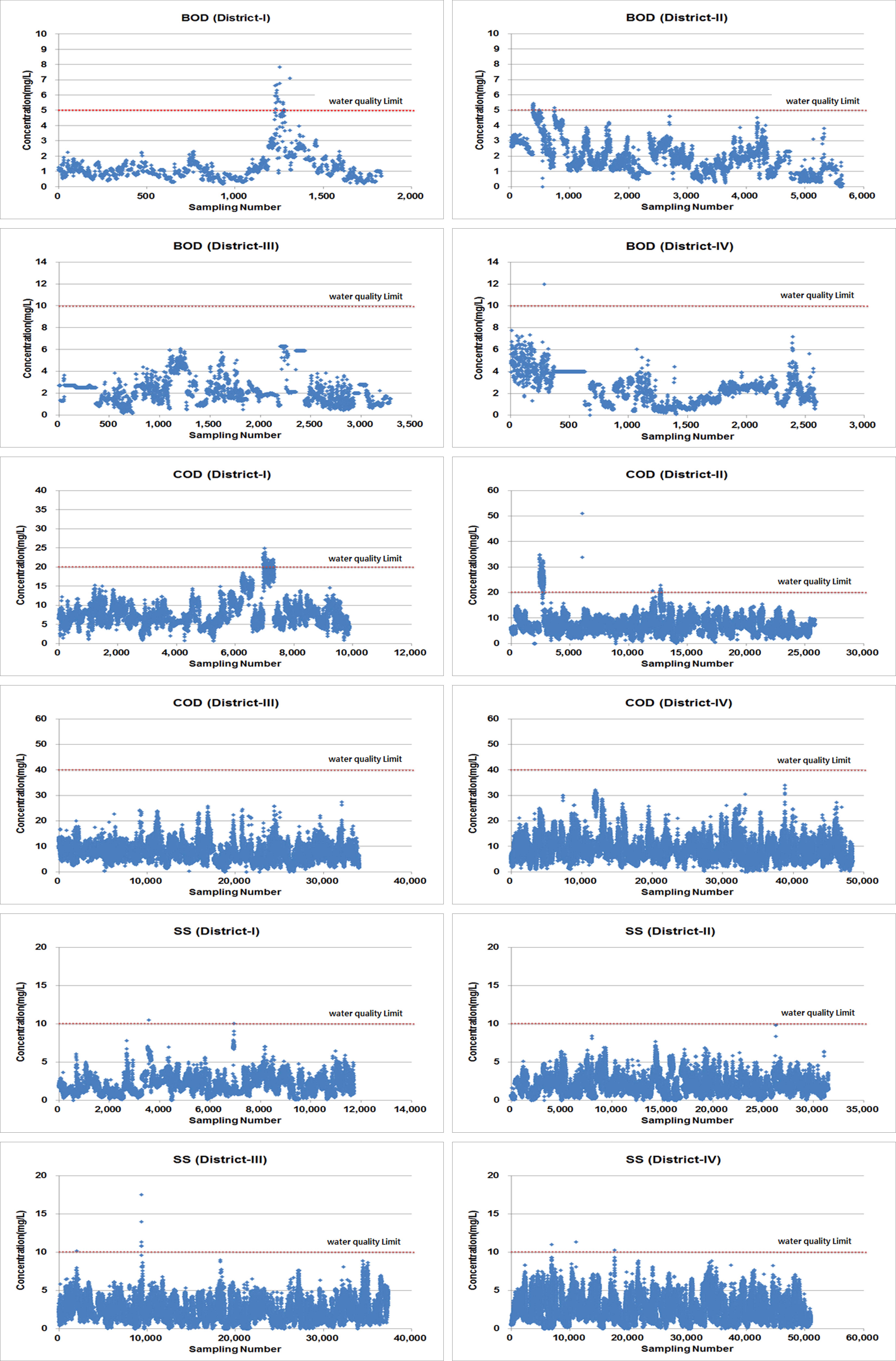수질현황 분석, 백분위수를 이용한 분석, 데이터 분포특 성 분석 등 통계기법을 이용하여 수질기준 준수율(98.56~100.00%), 수질기준 대비 평균값(19~40%), 백분위수, 정규 분포 특성값 등을 종합적으로 평가한 결과, 전체적으로 조 사대상 시설은 BOD, COD, SS에 대한 수질기준을 준수하 기에 적합한 시설과 기술을 갖추고 있는 것으로 평가되었다.