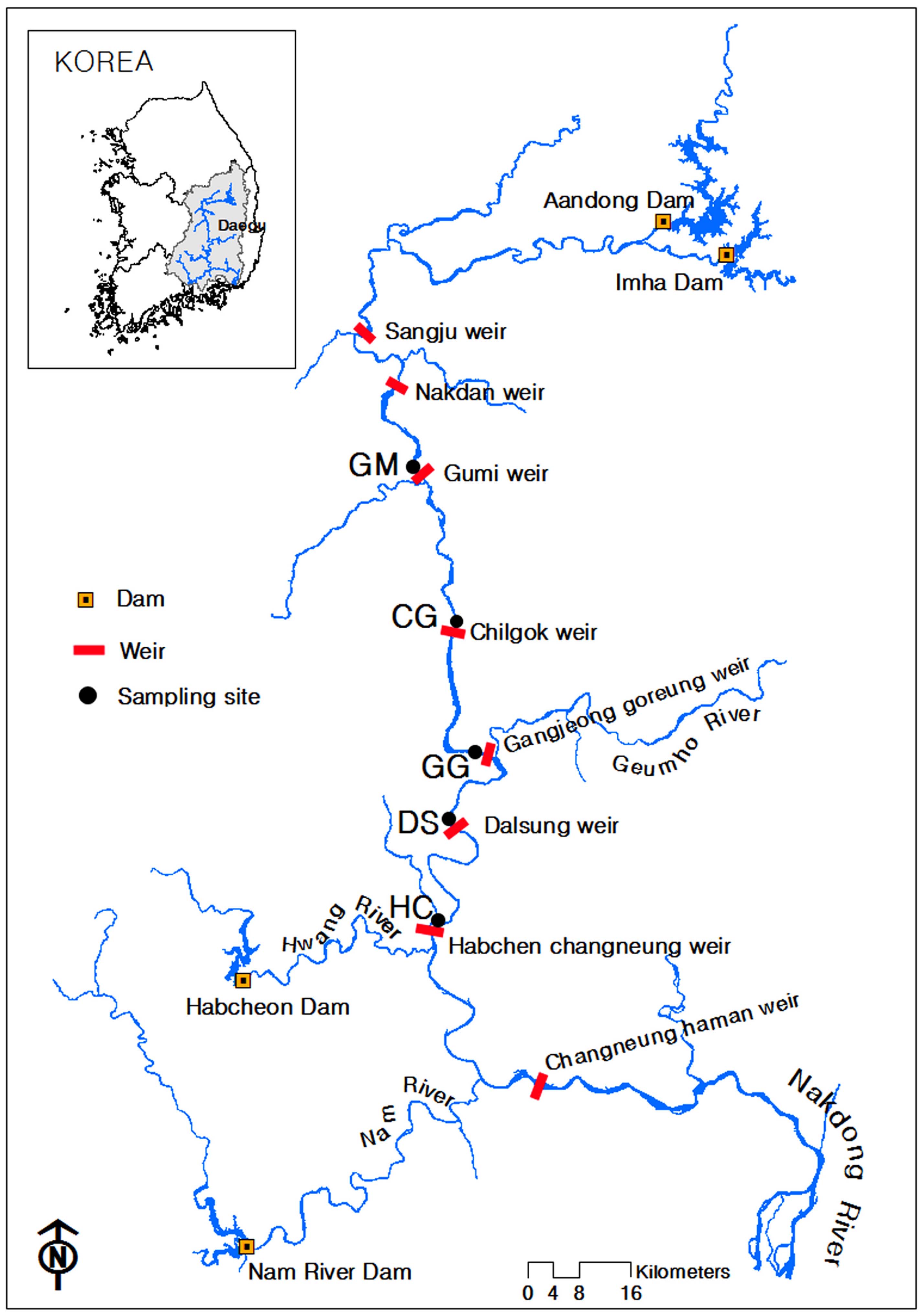 낙동강 살리기사업 추진으로 8개의 보가 설치되었다(Jun and Kim, 2011). 이번 연구대상 지점은 GM (구미보), CG(칠곡보), GG(강정고령보), DS(달성보), HC(합 천창녕보) 등 5개 지점이다(Fig. 1). 조사대상 구간길이는 120.0 km 이며, 보별 평균수심은 7.5 ~ 9.3 m 의 범위이며, 저수용량은 55.4 ~ 107.7 × 106m3이다(Table 1). 구미보 상류 에는 낙단보와 상주보가 있으며 합천창녕도 하류에는 창녕 함안보가 있다. 구미시의 하수와 폐수는 칠곡보 상류 8.7 km 지점에서