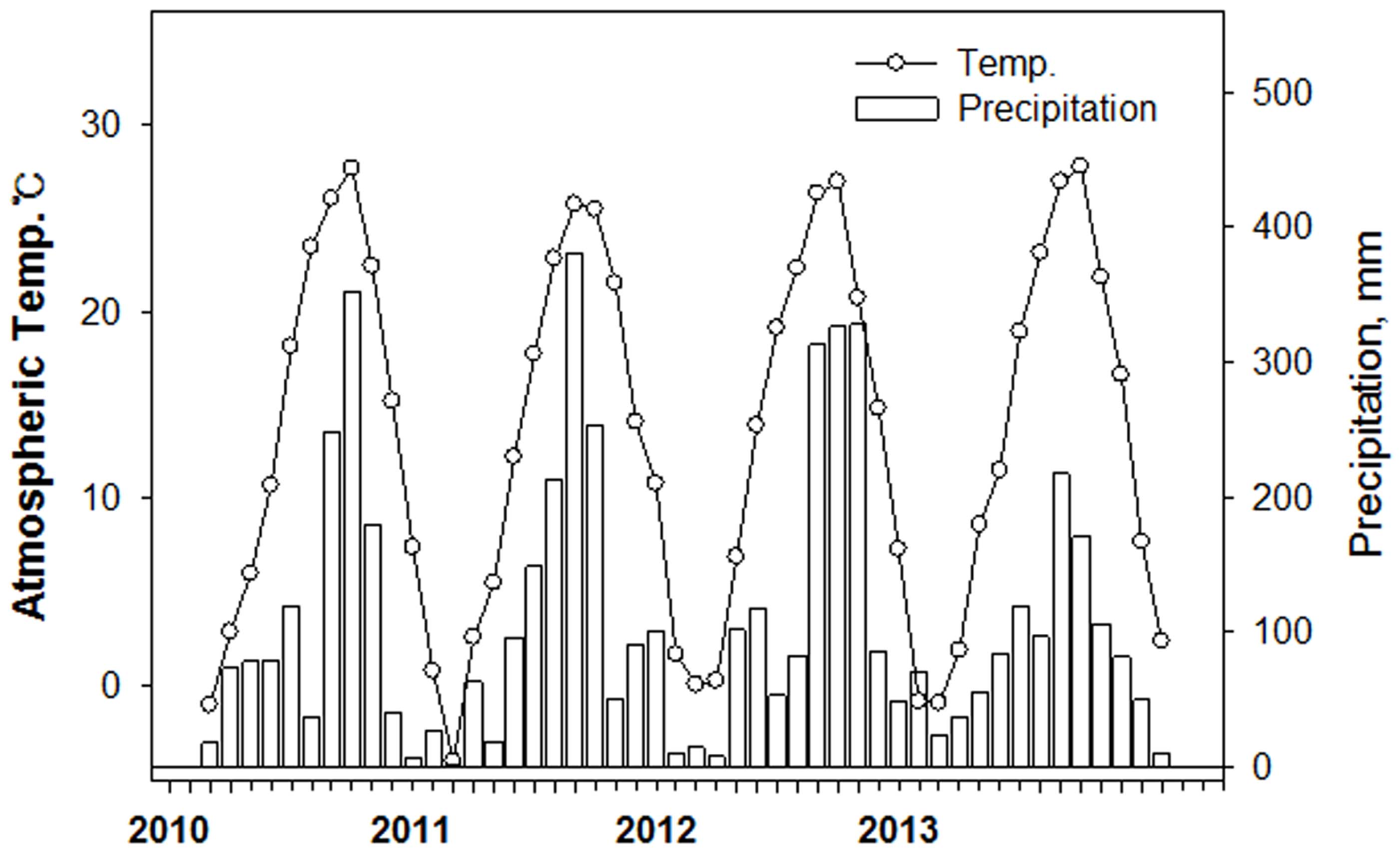 Fig. 2. Monthly variation of atmospheric temperature and precipitation in the Nakdong River, 2010~2013.