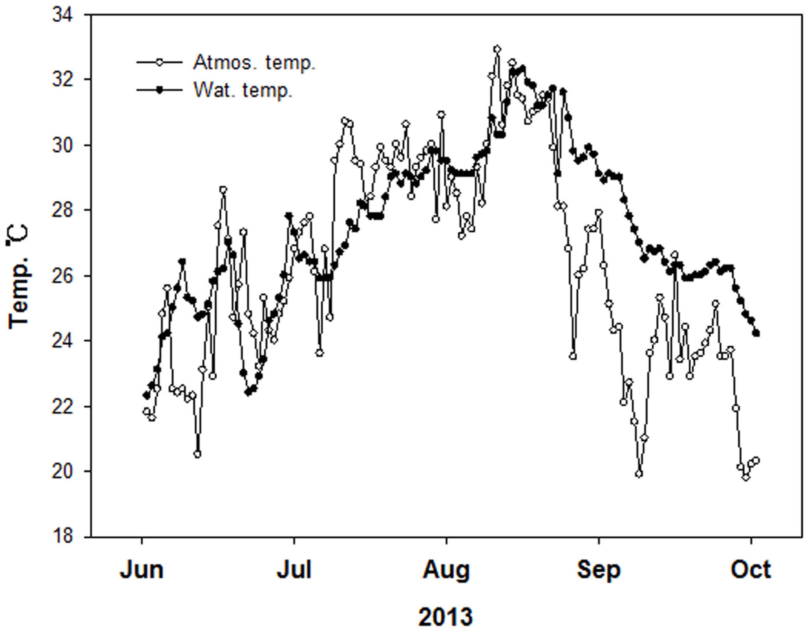 Fig. 3. Daily variations of atmospheric temperature and water temperature from June to September 2013 in GG site, Nakdong River.