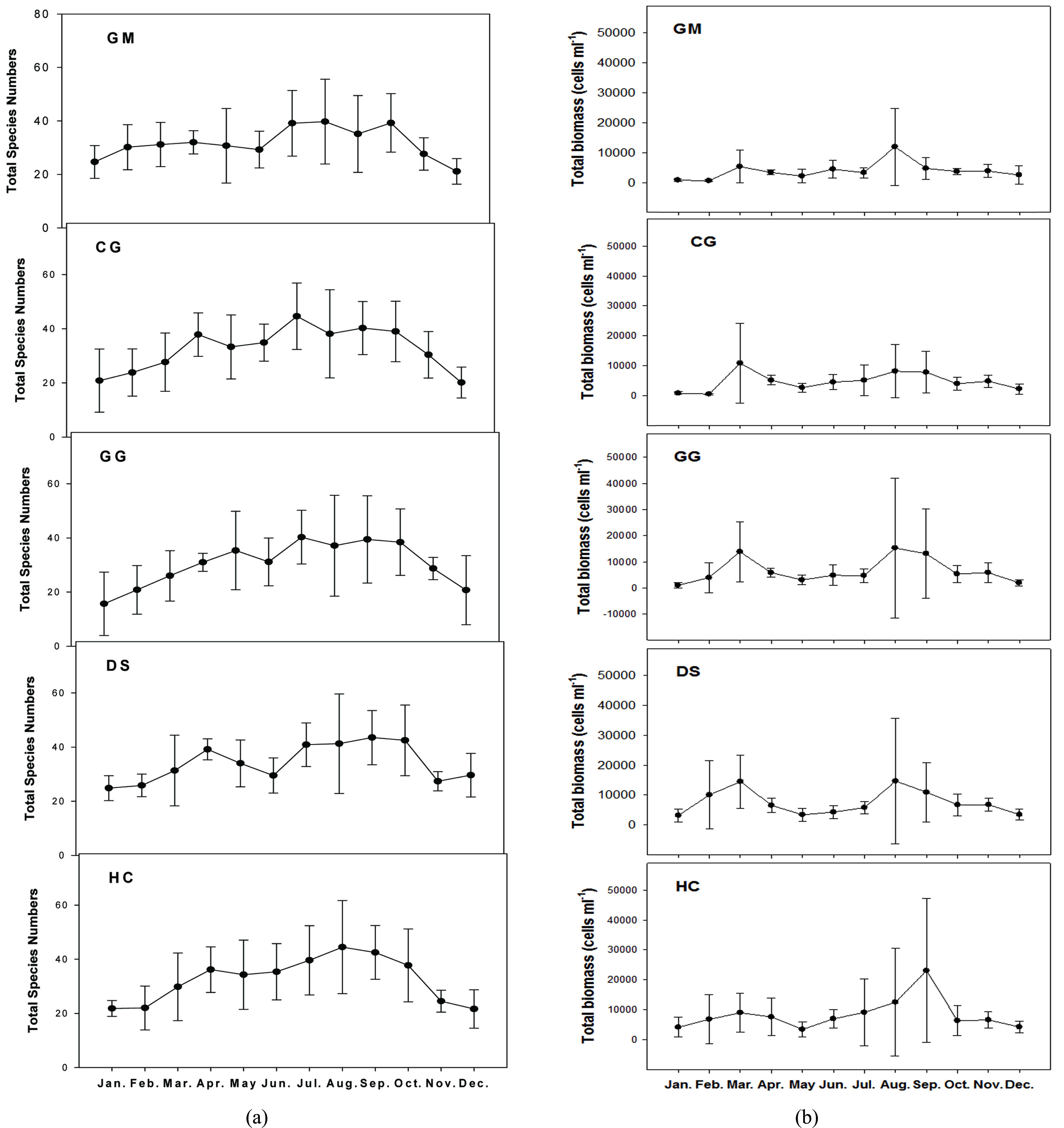 ANOVA를 이용해 수행되었다(SIGMASTAT, version 12). 환경인자와 식물성플랑크톤 개체 및 현존량과의 상호 관계는 Pearson correlation을