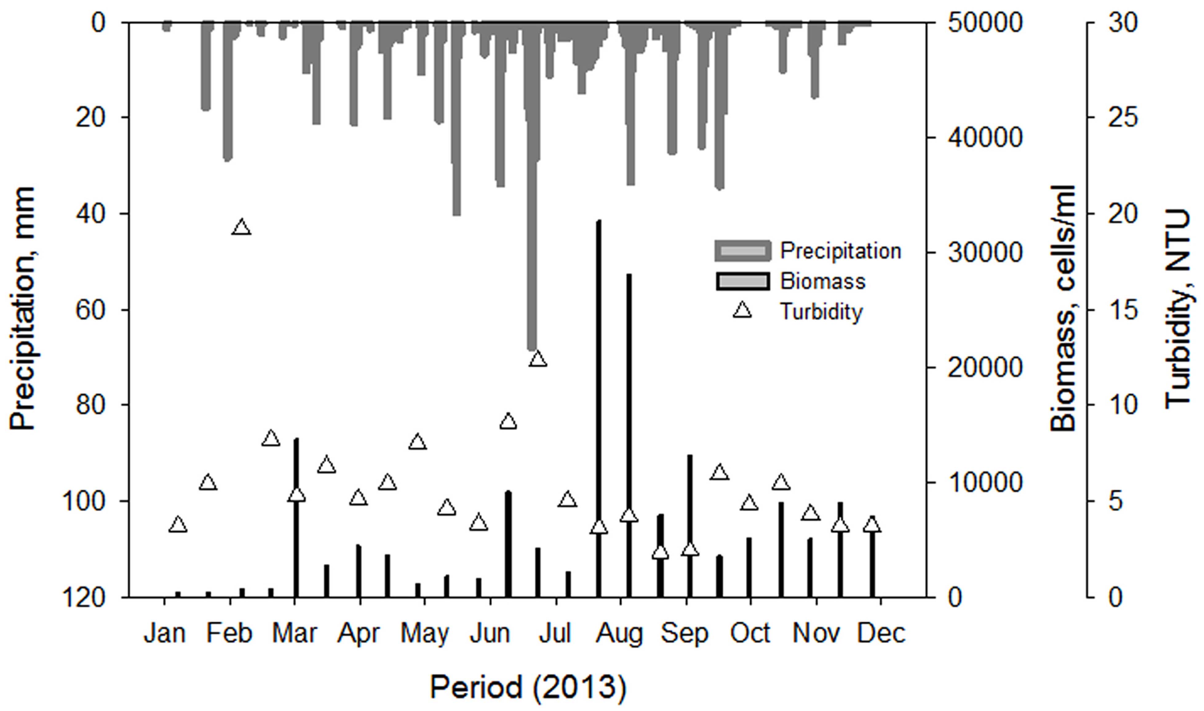 Fig. 8. Fluctuation of turbidity along to the changes of the precipitation and biomass in the study site GM.