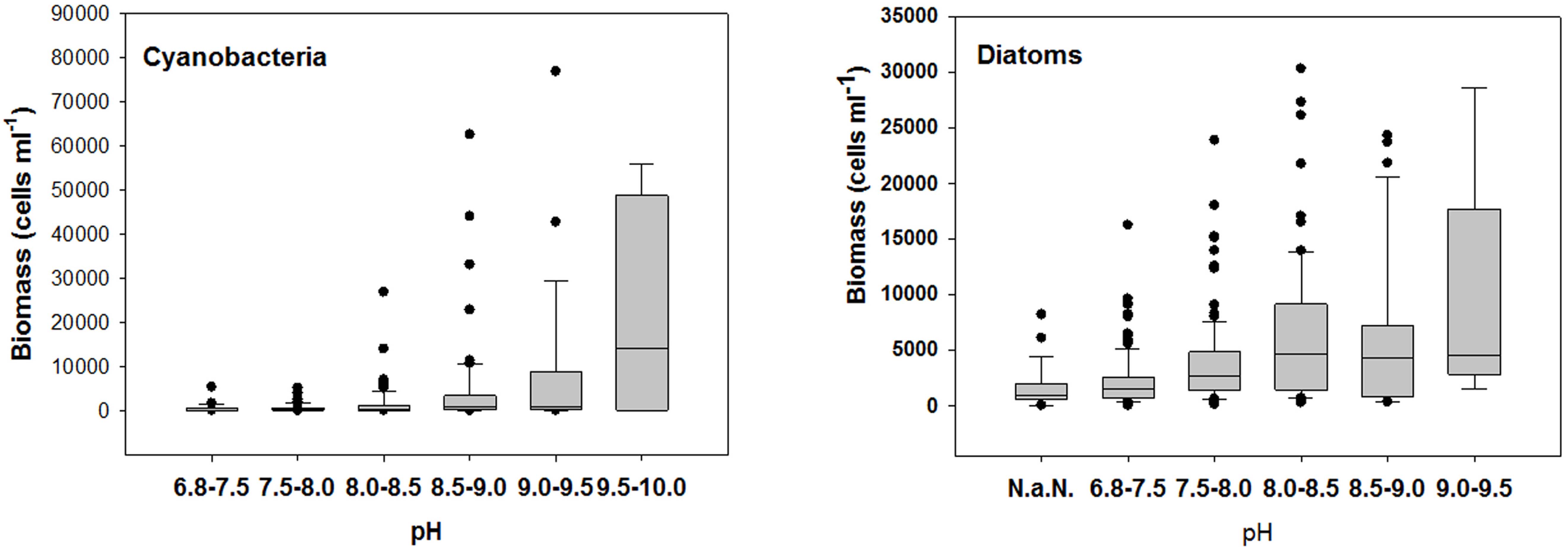 Fig. 9. Distributions of biomass of Cyanobacteria and Diatom each pH ranges in the Nakdong River (n=435).