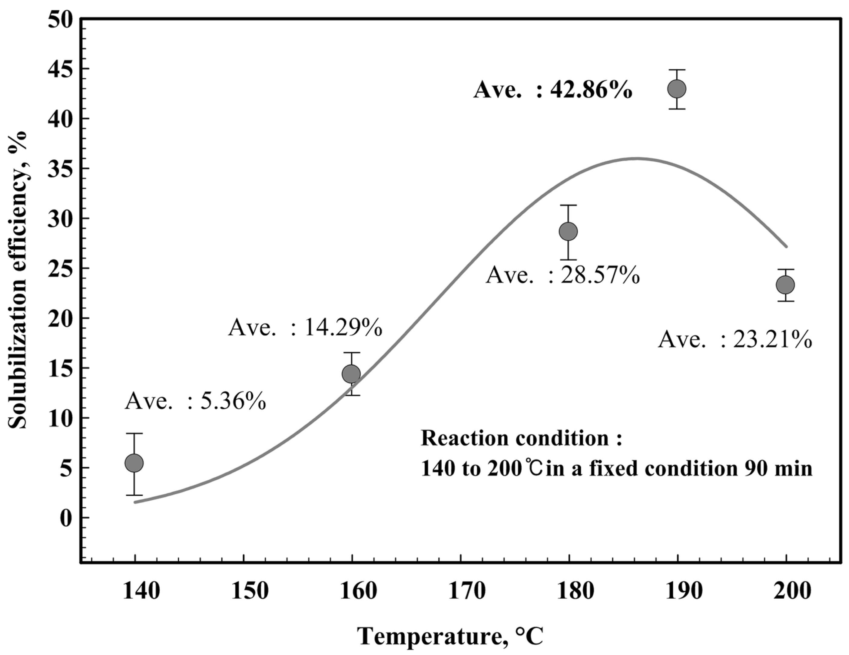 최적 조건을 도 출하기 위해 반응시간을 90 min으로 고정하고 조건별 반응 온도(140-200°C)에 따라 고형물 감량화 및 가용화율을 평가 하였다(Table