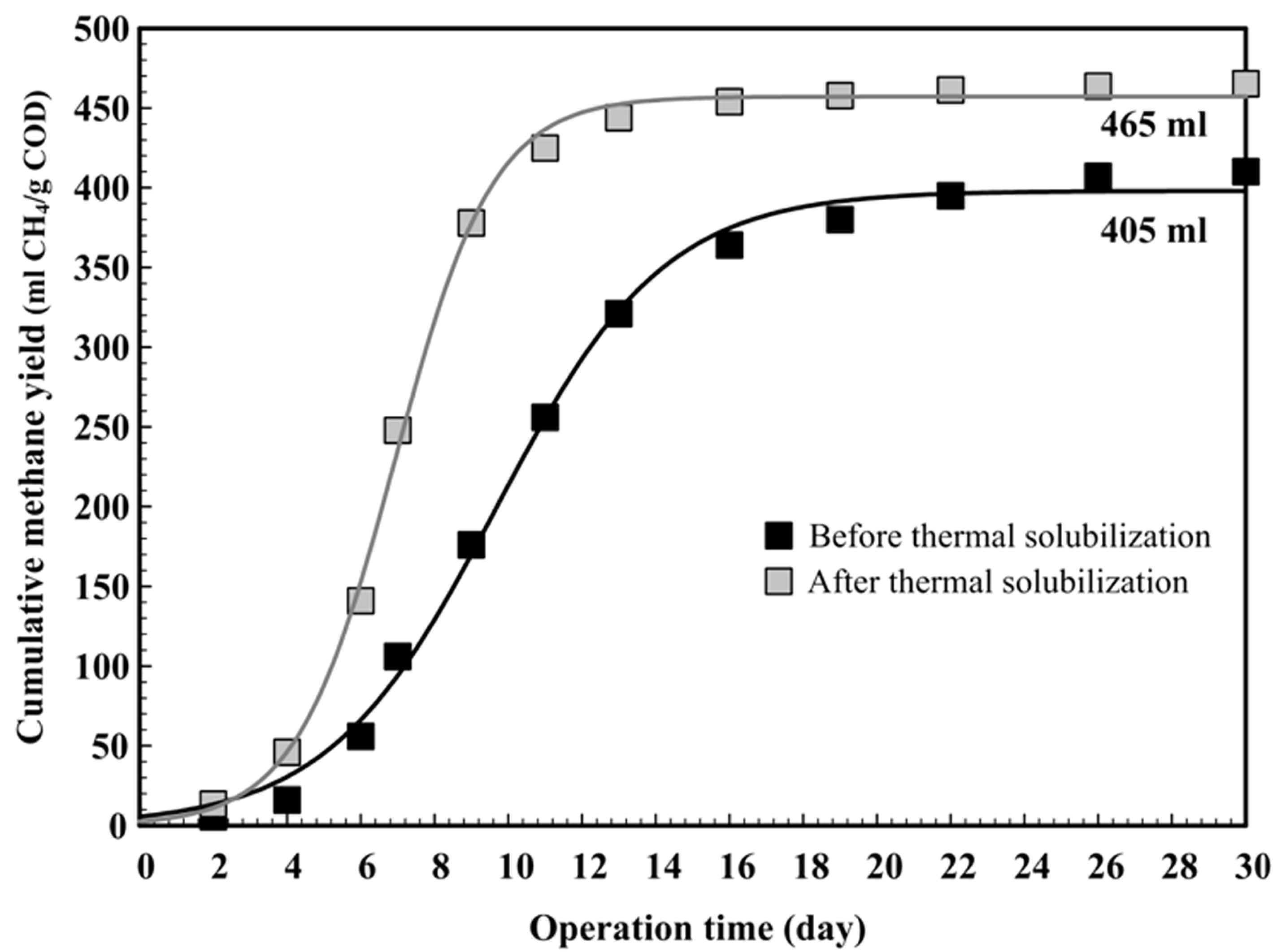 Fig. 7. Results of cumulative methane yields with the thermal solubilization.