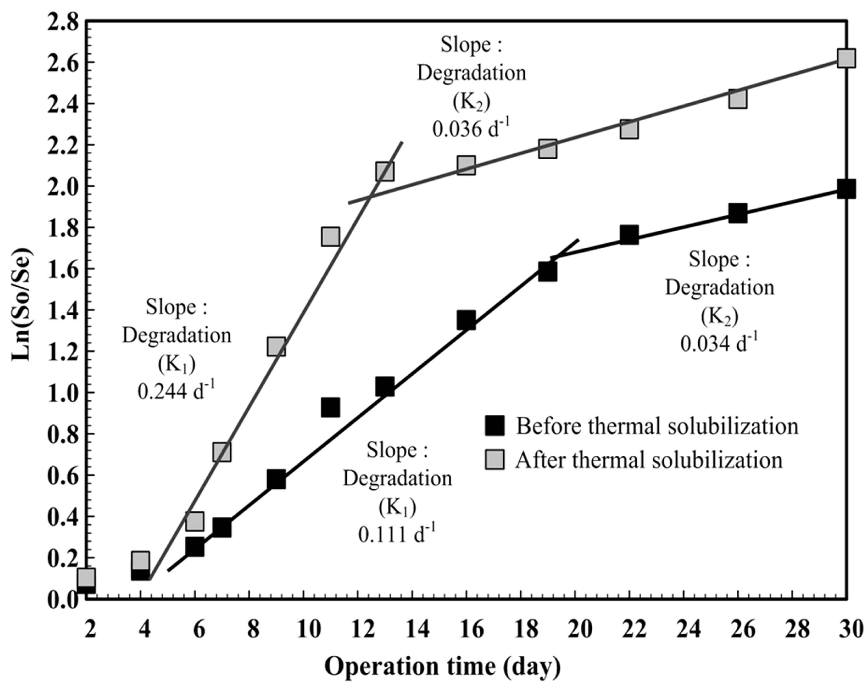 Fig. 8에는 ln(So/Se)와 운전시간의 그래프를 나타냈으며, 그래프를 통해 반응속도 k값을 도출하였다(Table 8). 가용 화 후 조건에서는 반응시간 6-12 day 사이의 반응속도 k1 값이 0.244 d-1로 분석되었으며, 반응시간 14-30 day 사이의 반응속도 K2는 0.036 d-1로 감소하는 것을 알 수 있었다.