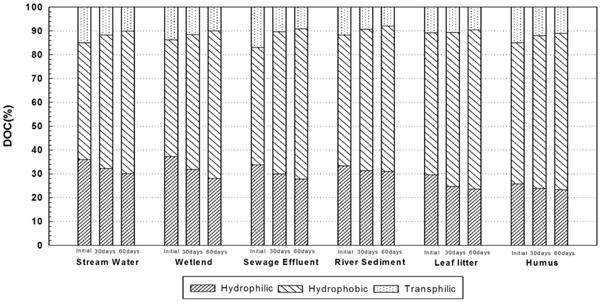 용이성은 hydrophilic > transphilic > hydrophobic의 순으로 나타난다는 것을 알 수 있다. Ogawa et al. (2001)은 glucose와 glutamate 등 생물학적 분해가 용이한 유기물도 생분해과정에서 난분해성의 유기물을 생성한다고 하였다. 수계에 유입된 유기물은