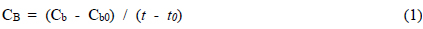 CB 는 바이오매스의 양, Cb 및 Cb0 은 t 와 t0 때의 바이오매스의 양을 나타낸다.