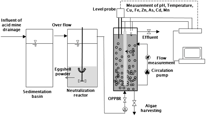 Fig. 2에 AMD 처리를 위한 폐난각과 도광판 삽입 광반응기(Optical Panel Photobioreactor, OPPBR)의 hybrid system을