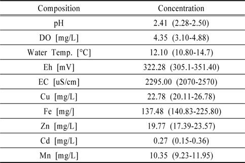 본 실험은 강원도 Y탄광의 AMD를 이용하였으며 AMD의 주요 중금속 함유량은 Table 1에 나타내었다. Y 광산에서 배출되는 AMD는 pH 3이하이며, Eh는 300-350 mV의 범위였다. AMD 내의 중금속 이온의 농도는 Fe>Cu>Zn>Mn>Cd