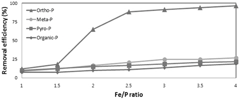 제거효율을 상승되었다. 그러나 정인산 인을 제외한 비 반응성 인인 메타인, 피로인, 유기인의 제거효율은 Fe/P의 몰비를 증가시켜도 제거효율의 상승폭은