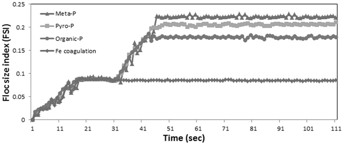 철 응집만을 수행한 경우에는 응집 플럭의 크기는 초기에 증가한 후 약 20초 후에는 정상상태에 도달하여 FSI의 값이 0.15로 일정하게 유지되는