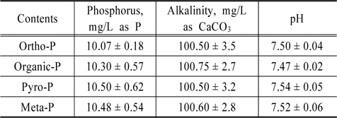 실험에 사용되는 인공하수의 알칼리도는 Na2CO3를 사용하여 평균농도를 100 mg/L (as CaCO3)로 조절하였으며 인의 농도는 10 mg/L로 조제하여 수행하였다. 실험에 사용된 유기인(C3H7O6P-Na2)은 (Kanto Chemical Co.) 5 수화물, 메타인(Na3O9P3)은 (Kanto Chemical Co.) 3 수화물, 그리고 피로인(Na4P2O7)은 (Junsei Chemical Co.) 10 수화물을 사용하였다. 조제한 인공폐수의 성상은 Table 1에 나타내었다.