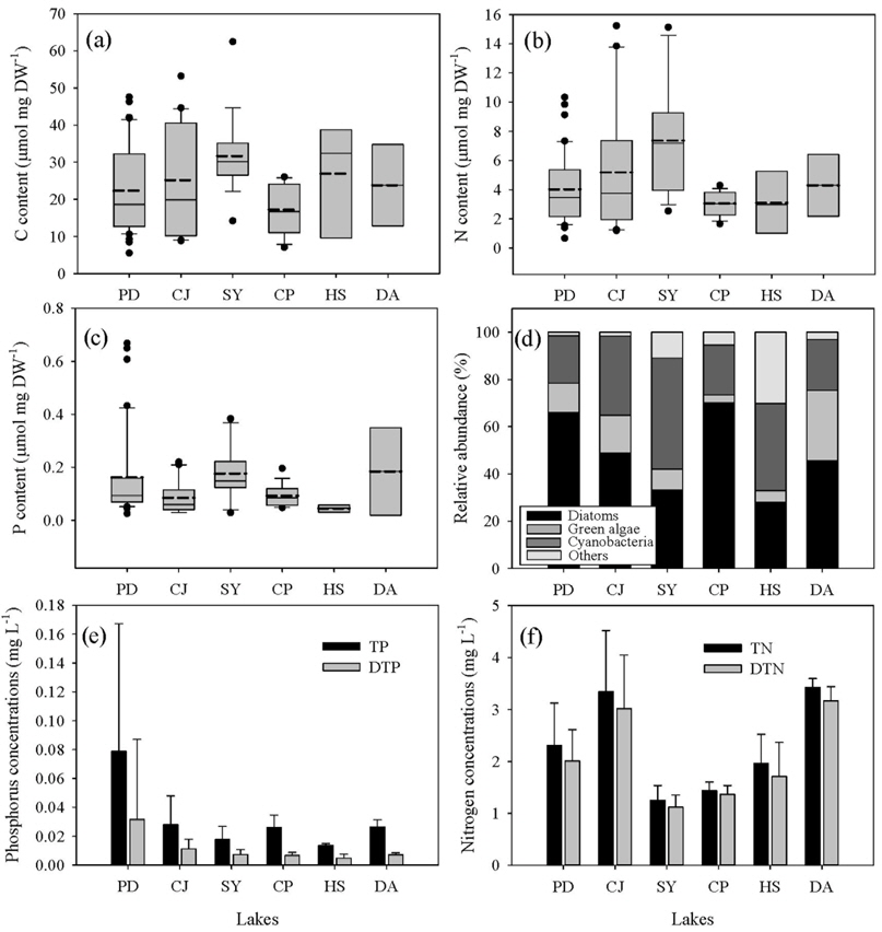 μmol C mg DW−1) 청평호가 가장 낮았으며(17.2±6.9 μmol C mg DW−1), 질소함량도 소양호가 가장 높았고(7.4±3.7 μmol N mg DW−1), 청평호와 횡성호가 낮았다(3.1±0.8, 3.1±2.1 μmol N mg DW−1). 인함량은 0.04~0.18 μmol P mg DW−1로 호수별로 큰 차이를 보이지 않았으며 도암호를 제외하면 각 호수에서 변동폭도 크지 않았다(Fig. 1(a), (b), (c)).