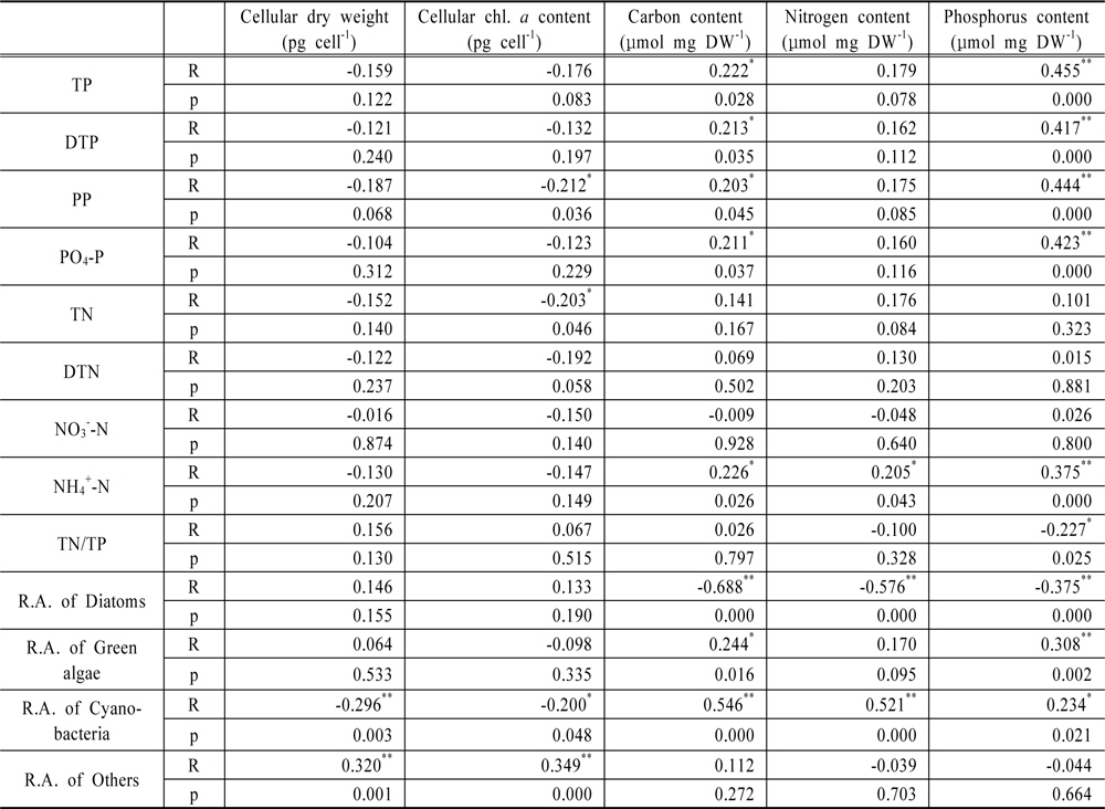 2) 수중 영양염류 농도와 식물플랑크톤 물질 함량, 세포당 건중량 및 클로로필 a 함량과의 상관관계를 분석한 결과, 수중 인 농도는 식물플랑크톤의 인 함량과 높은 양의 상관관계를 보였고, 탄소 함량과도 유의한 양의 상관관계를 나타내었다.