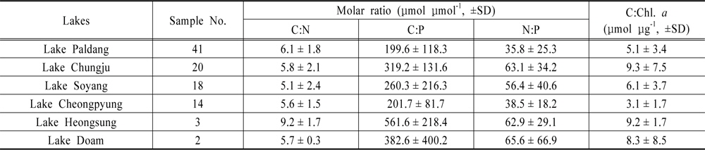 C:Chl. a 비는 전반적인 영양물질의 결핍여부를 판정하는 지표로 사용되는데(Hecky et al., 1993) 청평호와 팔당호는 4.2~8.3 μmol μg−1의 범위에 들어 중간정도의 영양물질 제한 상태로 나타났으며, 충주호와 횡성호는 8.3 μmol μg−1이상으로 극심한 영양물질 제한 상태로 나타났다. 이 결과는 N:P 비나 C:P 비로 평가한 인 제한 상태 평가와 일치하였다.