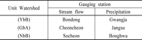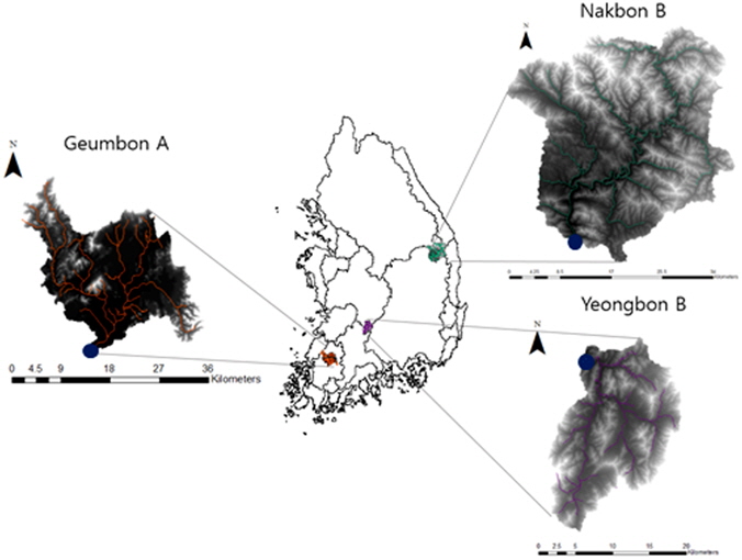 본 연구에서는 낙동강 유역의 Nakbon B (NbB), 영산강 유역의 Yeongbon B (YbB), 금강 유역의 Geumbon A (GbA) 수질오염총량단위유역을