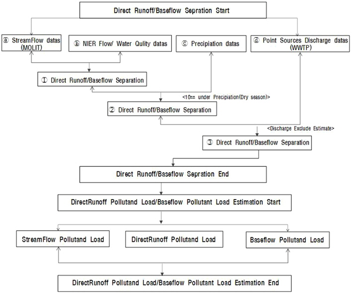 정량적으로 평가한 연구들은 아직까지 미흡한 실정이라 볼 수 있다. Kum et al. (2013)에 의하면 유역에서 발생하는 비점오염원이 하천으로 유입되는 경우는 크게 직접유출과 기저유출을 통해서 하천에 유입되고 있기 때문에 환경부에서 제시하고