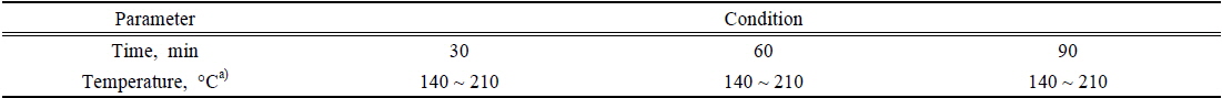 반응온도 변화에 따라 열가수분해 효율을 실험실 규모 열가용화 장치를 이용하여 평가하였다. Table 5 및 Fig. 2~4에는 반응시간에 따른 열가수분해 효율을 나타내었다.