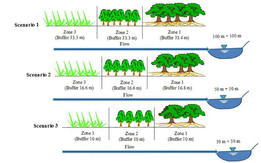 ์ฐ๊ตฌ ๋์ ์ ์ญ์ธ YbB์ GbA ์ ์ญ์ ๋ํด ์ด 3๊ฐ์ ์๋ณ๋ฆผ ์กฐ์ฑ ์๋๋ฆฌ์ค๋ฅผ ์์ฑํ์๋ค(Fig. 10). 1๋ฒ ์๋ณ๋ฆผ ์๋๋ฆฌ์ค๋ Zone 1 (Forest buffer) ๊ต๋ชฉ, Zone 2 (Forest buffer) ๊ด๋ชฉ, Zone 3 (Grass