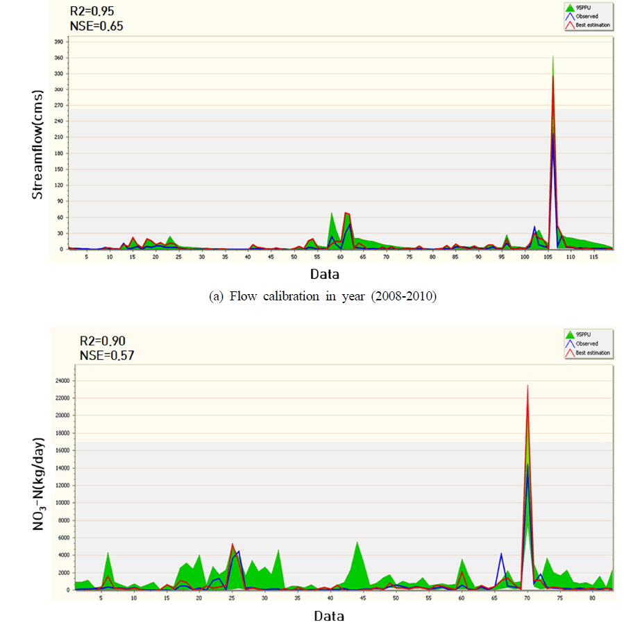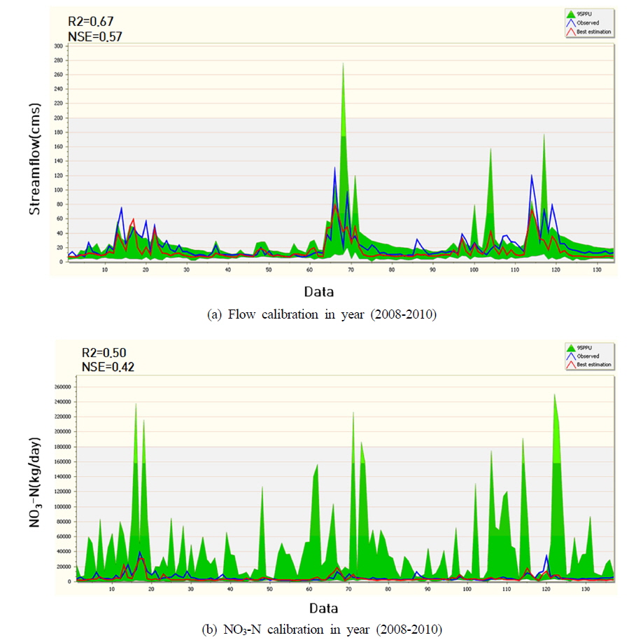 ๋ ฅํด์ผํ๊ธฐ ๋๋ฌธ์ ์ ์ญ ๋ด ๋ณธ๋ฅ๏ฝฅ์ง๋ฅ ํ์ฒ์ ์์ง ์๋ฃ๋ฅผ ์ด์ฉํ์ฌ ๋น์จ์ ๊ณ์ฐ ์ ์ฉํ์ฌ T-N์ NO3-N ์์ง์ ์ฐ์ ํ์๊ณ , ์ด๋ฅผ ์ค์ธก NO3-N ์์ง์ด๋ผ ๊ฐ์ ํ์ฌ SWAT-CUP์ ์ด์ฉํ์ฌ ์ผ๋จ์๋ก ์๋ ๋ณด์ ํ์๋ค.