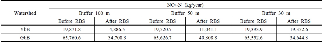 ๋ํ ์ ์ฒด์ ์ญ ์ถ๊ตฌ์์์ ๊ธฐ์ ์ ์ถ๋์ ๋ฐ๋ฅธ ์ง์ฐ์ฑ ์ง์(NO3-N)์ ๋ํ ์ ๊ฐํจ๊ณผ๋ฅผ ๋ถ์ํ์๋ค(Table 6). YbB ์ ์ญ์ ๊ฒฝ์ฐ ๊ธฐ์ ์ ์ถ๋์ ์ง์ฐ์ฑ ์ง์ ์ ๊ฐํจ๊ณผ๋ ์๋ณ๋ฆผ ํญ์ ๋ฐ๋ผ ๊ฐ๊ฐ 75.4%, 43.4%, 0.2%๋ก ๋ํ๋ ์๋ณ๋ฆผ ํญ์ด ์ปค์ง์๋ก