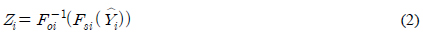 여기서 Yi를 i번째 지점의 기상 변수값이라고 하면 Zi는 오차 보정된 값을 의미하고, Foi(·)와 Fsi(·)는 각각 해당변수의 예측값과 관측값에 대한 경험적 확률 분포이다.