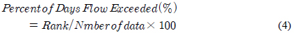 5가지 편의보정 기법에 따라 편의보정 된 미래 기후변화 시나리오의 예측 강수자료를 활용한 미래기간에 대한 강우-유출 특성을 분석은 2021년 ~ 2100년 까지 20년씩 기간을 구분하여 각 기간별 첨두유량의 크기, 평균 유량, 총 유량을 비교하였다. 그리고 유량조건을 확률적으로 파악하기 위해 식 4와 같이 일유량 자료를 최대유량에서 최소유량 순으로 배열하여 특정유량을 초과하는 일수를 백분율로 계산하는 유량지속곡선(Flow Duration Curve, FDC)을 작성하고 이를 토대로 구간별 최대유량, 평균유량 등을 비교 분석하였다. 본 연구에서는 Cleland (2003)이 정의한 것과 같이 초과 유량 확률에서 10% 까지는 고유량(High-Flow), 10 ~ 40%는 습한상태(Moist-conditions), 40 ~ 60%는 중간유량(Mid-range-Flow), 60 ~ 90%는 건조상태(Dry-conditions), 90% 이상은 저유량(Low-Flow)으로 구분하였다.
