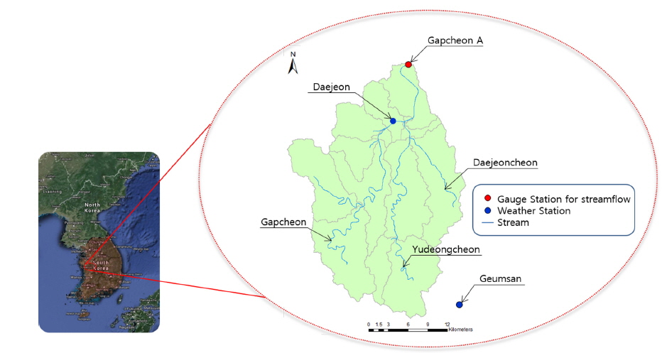 갑천유역은 금강권역에 속하며 충청남도 계룡시, 논산시, 금산군, 대전광역시를 포함하고 있다. 유역면적은 648.3 km2이며 유로연장은 73.7 km로 대전광역시의 3대 하천인 대전천, 갑천, 유등천이 흐르고 있다(Fig. 1). 유역 상류지역에 속하는 계룡시, 논산시, 금산군은 대부분 산림지역이며 하류지역에 속하는 대전광역시는 도시화 지역이다. 여름철 장마철을 제외하고는 유등천과 대전천은 갈수기와 홍수기의 유량 차이가 커 하상계수가 높고, 이와 반대로 갑천은 연중 유량변화가 크지 않다(Lee et al., 2006). 그리고 대전기상 관측소(1981년 ~ 2010년)를 기준으로 연평균 강수량은 1,458 mm로 국내 연평균 강수량 1,331 mm에 비해 높으며 계절별 평년값은 봄 241.0 mm, 여름 869.7 mm, 가을 258.2 mm, 겨울 91.0 mm로 국내 계절별 평년값 봄 262.9 mm, 여름 721.2 mm, 가을 276.4 mm, 겨울 113.4 mm에 비해 여름철 강수량이 높은 것으로 나타났다(KMA, 2011).