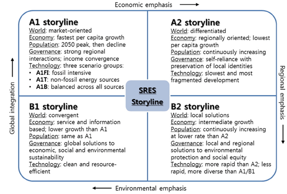 IPCC에서는 Data Distribution Center(DDC)를 통해 미래 기후변화 예측을 결정하는 사회·경제적 가정에 대한 정보와 미래의 인구·국민총생산·이산화탄소 농도 및 순환 등을 가정하는 시나리오를 제공하고 있다. 최근 IPCC 5차 평가보고서에 도입한 온실가스 시나리오를 통해 작성된 Representative Concentration Pathways(RCP) 기후변화 시나리오가 제공되고 있지만, IPCC의 3차 평가보고서에서 사용된 온실가스 증가 시나리오를 기반으로 작성된 Special Report on Emission Scenarios(SRES)가 기후변화에 대응하기 위한 과학적 기초자료 구축에 널리 활용되어 왔다(Arnell et al., 2004; Parry et al., 2004; Robert, 2004). SRES 시나리오는 이산화탄소 배출 양에 따라 A1, A2, B1, B2 시나리오로 재분류되는데(Fig. 2), 4개의 스토리라인은 각각에 대한 기본 특성 및 추진력에 따라 개별적인 시나리오로 전개된다 (Shin, 2013).