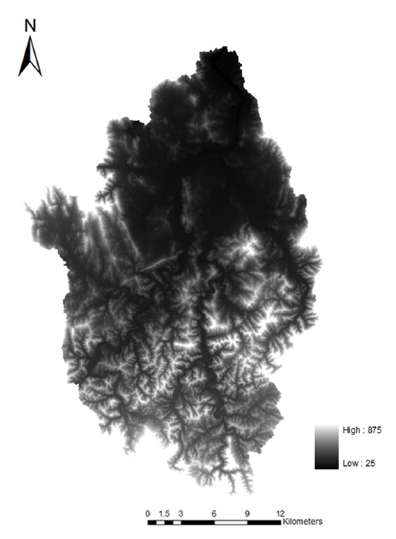 SWAT 모형은 시간적 변화와 공간적 분포를 고려하여 유출 특성을 분석하는데, 시간적 변화를 고려하기 위한 기상자료(일 강수량, 기온, 풍속, 일사량, 상대습도)와 공간적 분포를 고려하기 위한 토양속성, 토지이용현황 그리고 지형자료를 필요로 한다. 기상자료는 갑천유역 내 위치한 대전관측소와 인근 금산관측소의 관측자료를 기상청을 통해 구축하였는데, Lee et al. (2013)의 연구에서 SWAT모형에 적용되는 5가지 기상자료가 유출해석에 미치는 영향을 분석한 결과 강수량에 대해 가장 민감한 것으로 나타났고, 강수량 자료를 제외하고는 유출 해석에 큰 영향을 주지 않는다고 하였다. 이에 본 연구에서 기후변화 시나리오를 적용한 미래 장기 유출 해석시 강수 자료를 제외한 기온, 풍속, 일사량, 상대습도는 과거 자료(1980년 ~ 2011년)를 활용하였다. 그리고 토양도는 농촌진흥청 농업과학기술원에서 제공하는 개략토양도(1:50,000)을 사용하였고(Fig. 3), 토지이용도는 환경부 환경공간정보서비스에서 제공하는 2005년 대분류 토지피복도(1:25,000)를 사용하였다(Fig. 4). Digital Elevation Model(DEM)은 국립지리원에서 제공하는 수치지도(1:5,000)을 이용하여 구축하였다(Fig. 5).