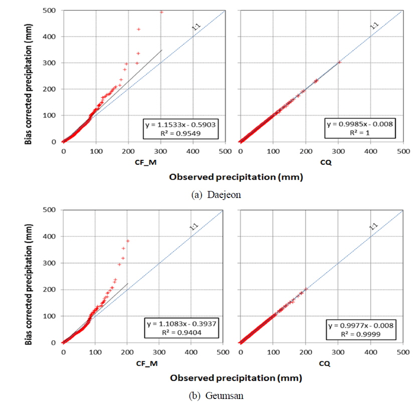 그러나 Kum et al. (2014)은 기후변화 시나리오의 일별 편의보정에서 일자별로 강수량을 정확히 보정하기에는 기후 변화 시나리오의 한계로 인해 불가능하며, 최대한 편의보정을 통해 과거 강수량의 크기, 발생 분포 및 빈도 등을 기후 변화 시나리오에 재현 및 적용하는 것이 중요하다고 하였다. 본 연구에서도 관측 강수량의 재현 관점에서 관측 강수량과 편의보정 결과를 소팅(sorting) 비교 한 결과 Kum et al.(2014)이 분석한 결과와 같이 R2 = 1로 CQ가 CF_M에 비해 과거 편의보정 기간 동안 관측 강수 크기 및 분포를 가장 잘 재현 및 적용하는 것으로 나타났다.