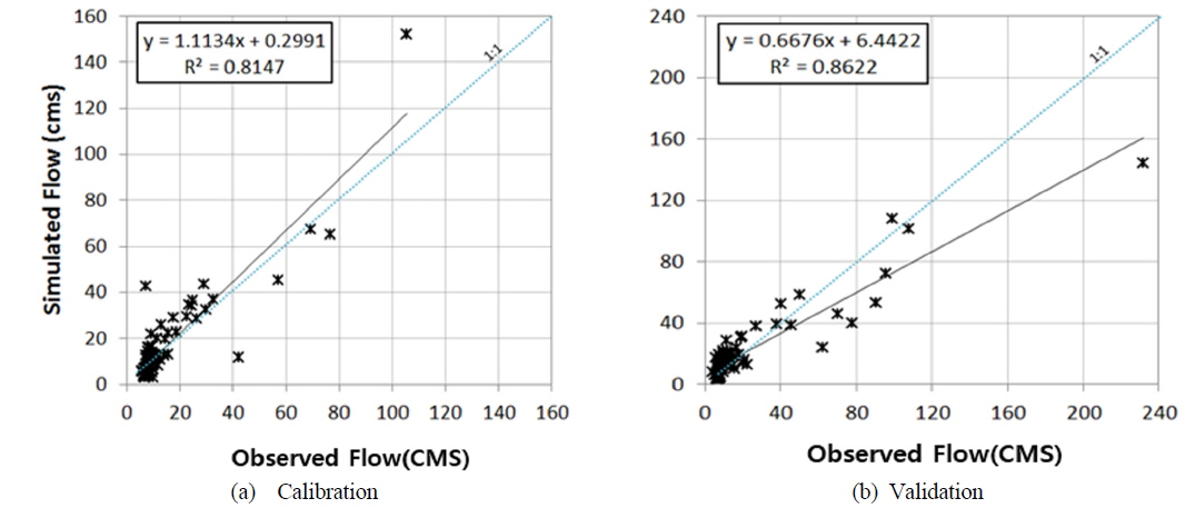 갑천A 지점의 2007년 부터 2008년까지의 8일 간격 유량자료와 선정된 10개의 매개변수를 이용하여 SWAT 모형을 보정한 결과 Table 4와 같이 최적 매개변수가 산정되었고, 이에 대한 SWAT모형에 의한 예측치는 실측치에 대해 NSE가 0.71, R2가 0.81로 나타났다. 이 매개변수를 이용하여 검정한 결과(2009년~2010년), NSE는 0.81, R2는 0.86으로 Donigian (2000)이 제시한 기준에도 매우 높은 적용성 결과를 보였다(Fig. 8).