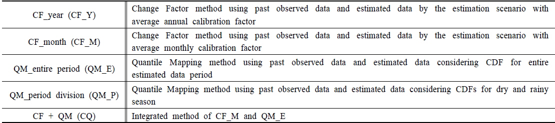 그리고 Kum et al. (2014)은 두 편의보정 기법(CF기법, QM기법)은 일별/월별 강우특성을 고려하기에 한계점이 있어 두 편의보정 기법을 연계한 CF+QM(CQ)기법을 제안하였다. 이기법은 CF 기법을 통해 기후변화 시나리오의 강우 예측치에 월별 강우 특성을 반영한 편의보정 후, QM 기법을 통해 다시 한 번 과거 일정기간동안의 강수발생일수, 최대 일 강수량 등을 고려한 확률분포를 반영하는 방법이다. 이에 본 연구에서는 A1B 시나리오와 대전기상관측소 및 금산기상 관측소의 1984년 부터 2013년까지의 시나리오 예측 강우량과 관측 강우량 자료 활용하여 연평균과 월평균 교정계수를 산정하여 편의보정을 수행한 CF 기법과 총 편의보정 기간과 우기(4월 ~ 10월)와 비우기(11월 ~ 3월)을 구분하여 누적확률분포를 고려한 QM기법 그리고 Kum et al. (2014)이 제안한 CF+QM 기법 총 5가지의 편의보정 기법에 대해 편의보정을 수행하였다(Table. 1).