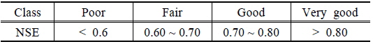 NSE는 1에 가까울수록 모델의 예측치가 실측치를 잘 반영하는 것을 의미하며, 0보다 작을 경우 모델의 예측결과가 실측값과 적합성이 없음을 의미하며, 효율 범위와 신뢰구간은 다음과 같다(Table 2)(Donigian, 2000).