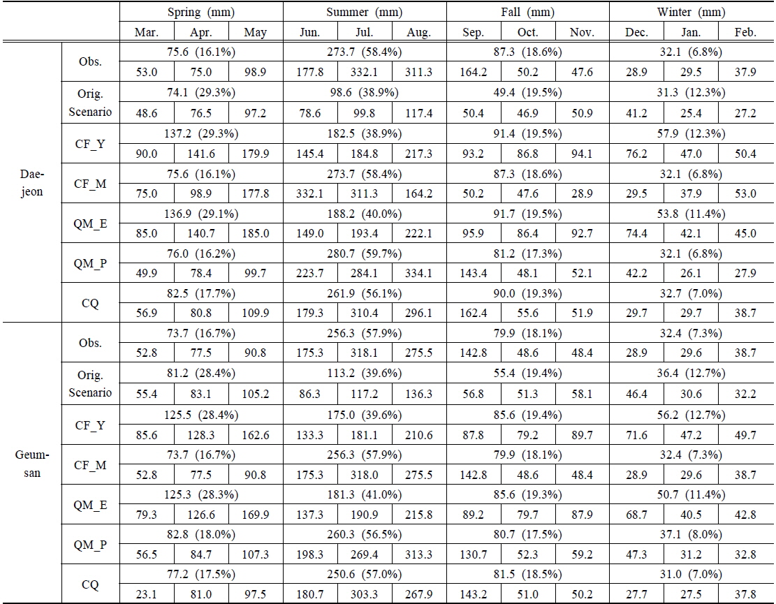 본 연구에서는 CF기법에서 연평균 보정계수(CF_Y)와 월평균 보정계수(CF_M)를 이용하는 방법과 QM기법에서 총 보정기간 동안을 고려하여 확률분포를 산정하는 방법과 우기와 비우기를 구분하여 확률분포를 산정하는 방법(QM_E, QM_P) 그리고 Kum et al. (2014)이 제안한 CF기법과 QM 기법을 연계한 CF+QM기법(CQ) 총 5가지 기법을 이용해 각각 편의보정을 수행하고 계절별/월별 특성을 분석하였다 (Table 3). 1984년 부터 2013년 까지 총 30년에 대한 편의보정 결과 보면 이 기간 대전관측소 기준 총 관측 강수량 42,192.6 mm은 CF_Y 42,200.7 mm, CF_M 42,193.4 mm, QM_E 42,348.3 mm, QM_P 42,291.5 mm, CQ 42,042.9 mm로 총 강수량에서는 큰 차이가 발생되지 않았다. 그러나 금산관측소는 총 강수량 39,806.3 mm, CF_Y 39,804.1 mm, CF_M 39,805.5 mm, QM_E 39,859.0 mm, QM_P 41,487.9 mm, CQ 39,626.0 mm로 QM_P에서 16,81.6 mm 크며 편의보정되는 것으로 나타났다. 그리고 봄(3월~ 5월), 여름(6월~ 8월), 가을(9월 ~ 11월), 겨울(12월 ~ 2월)로 강수량을 비교한 결과 대전 관측소와 금산관측소 모두 여름 강수량이 전체 강수량에 58%를 차지하고, 가을 18%, 봄 16%, 겨울 7% 순으로 강수량이 분포하지만 CF_Y, QM_E 는 기존 기후변화 시나리오의 강수 분포를 그대로 유지하여 여름 39%, 봄 28 ~ 29%, 가을 19%, 겨울 12% 순으로 봄과 여름 강수량 차이가 크지 않는것을 나타났다. 이를 제외한 CF_M, QM_P, CQ는 과거 관측 강수 분포와 비슷한 분포를 나타내어 계절별 편의보정에 적합한 것으로 나타났다. 하지만 월별 편의보정 결과를 비교한 결과에서 QM_P는 월별 강수 발생 특성을 제대로 반영하지 못하는 것으로 나타났다. 특히 강수가 집중되는 여름에 CF_M, CQ는 기상청 관측자료와 같이 7월에 가장 많은 강수량이 발생되고 8월부터 강수량이 감소하지만, QM_P는 8월에 가장 많은 강수량이 발생되고 9월 급격히 감소하는 것으로 나타났다 (Fig. 6). 이러한 결과는 미래기간에 대해 강우-유출 분석시 월별 유출 분석에 큰 차이가 발생될 수 있을 것으로 판단된다.