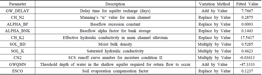 SWAT 모형을 통해 기후변화 시나리오 편의보정 기법에 따른 유출 특성을 분석하기에 앞서 SWAT-CUP을 이용한 SWAT모형의 매개변수 최적화 작업을 수행하였다. 매개변수는 민감도 분석을 통해 P-value 0.1 이하의 10개 매개변수를 선정하였다.