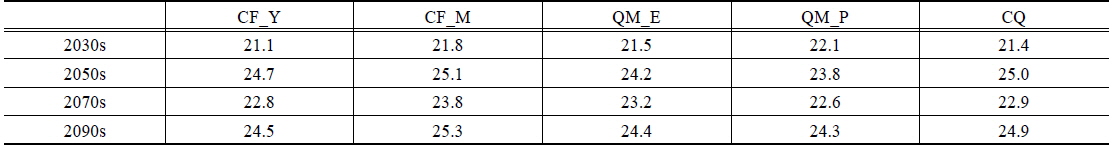 본 연구에서는 5가지 편의보정기법에 따라 2021년~ 2040년 (2030s), 2041년~ 2060년(2050s), 2061년~ 2080년(2070s), 2081년~ 2100년(2090s) 총 5개 기간으로 구분하여 미래기간에 대한 강우-유출 해석 특성을 비교 분석하였다. 기간별 평균유량을 비교한 결과 2030s에 21.1 m3/s ~ 22.14 m3/s, 2050s에 23.79 m3/s ~ 25.12 m3/s, 2070s에 22.63 m3/s ~ 23.75 m3/s, 2090s에 24.32 m3/s ~ 25.29 m3/s로 편의보정 기법에 따라 큰 차이를 보이지 않았다(Table 5). 하지만 본 연구에서 사용한 SRES A1B 시나리오는 이산화탄소 배출량이 점차 증가하여 2050년경에 정점에 도달 후 감소한다는 시나리오인데, 시나리오의 기본 특성을 유지하여 강우-유출 해석이 이루어지는 편의보정 기법은 CF_Y와 CQ인 것으로 나타났다. 다른 편의보정 기법은 2090s에 평균 유량이 가장 큰 것으로 나타났다.