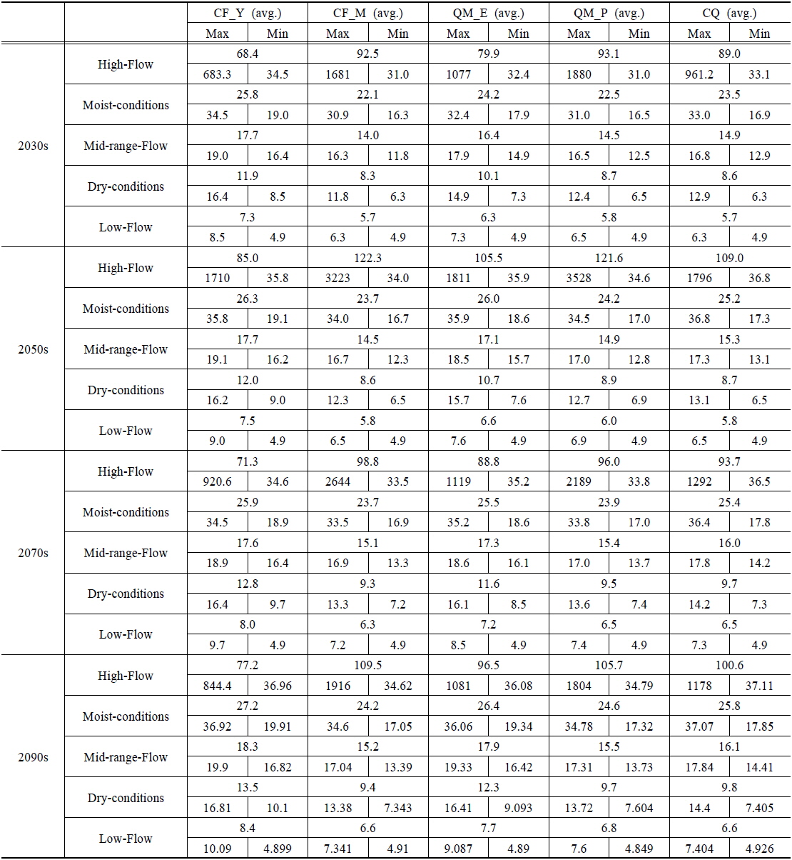 유량조건별 분석 결과 고유량에서 편의보정 기법에 따라 첨두유출, 평균유량에 큰 차이가 발생되는 것으로 나타났다(Table 6). 2050s의 첨두유량을 비교해 보면 CF_Y는 1,710 m3/s, CF_M은 3,223 m3/s, QM_E는 1,811 m3/s, QM_P는 3,528 m3/s, CQ는 1,796 m3/s로 CF_M과 QM_P이 다른 편의보정 기법에 비해 약 2배 정도 큰 첨두유량을 보이는 것으로 나타났으며, 다른 기간에 대해서도 같은 경향의 결과를 보였다. 그리고 고유량 조건에서 CF_M과 QM_P가 CF_Y, QM_E, CQ에 비해 평균 유량이 크지만, 다른 유량조건에서는 평균 유량이 작게 나타났다. 이는 다른 기법보다 CF_M과 QM_P에 의해 더욱 크게 보정된 첨두유량의 결과로 극한 기후의 유량 분석시에 적합한 편의보정 기법으로 판단된다. 하지만 앞서 편의보정에 따른 강수자료 분석에서 CF_M이 QM_P에 비해 월별 편의보정에 더 적합한 결과를 보였기 때문에 극한 강우에 따른 극한 홍수/가뭄 분석에 CF_M이 더 적합한 것으로 사료된다. 하지만 다른 한편으로는 지속 가능한 수자원 관리 계획 수립을 위한 현실적인 강우-유출 해석 방안도 필요한데 앞서 유량 분석 결과에서 CF_M과 QM_P는 극한 기후에 적합한 것으로 나타났고, CF_Y와 CQ가 기존 기후변화 시나리오의 기본 특성을 유지한 강우-유출 해석이 이루어지는 것으로 나타났다. 그러나 편의보정 기간 동안의 강수 특성 분석과 Kum et al. (2014)연구에서 CF_Y와 QM_E는 월별 강수 특성 및 일별 강수크기의 재현과 반영에 한계점이 있다고 하였다. 따라서 본 연구에서 적용한 5가지 편의보정 기법 중에 월별 강수 특성을 반영하면서, 동시에 일별 강수 크기를 가장 잘 반영하는 CQ가 가장 적합한 편의보정 기법으로 판단된다.