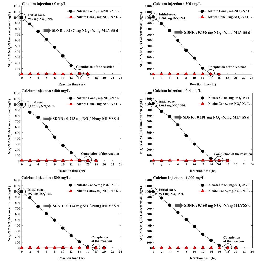 mg/L)에 따른 질산성 질소의 탈질 반응은 500 mg/L까지는 SDNR 값이 0.218에서 0.256 mg NO3--N/mg MLVSS·d로 증가하다가 800 mg/L부터 1,500 mg/L까지는 0.194에서 0.165 mg NO3--N/mg MLVSS·d로 감소하는 경향을 나타내 본 연구와 유사한 결과를 나타내고 있었다. 또한 이에 대한 원인을 첨가된 칼슘이온에 의해 표면전하가