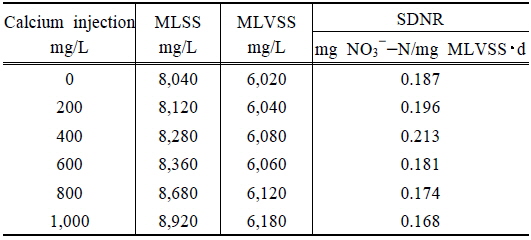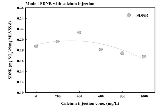 칼슘이온 주입에 따른 SDNR의 경우 칼슘이온 미주입시 0.187 mg NO3--N/mg MLVSS·d를 나타냈으며 200, 400 mg/L 주입시 각각 0.196, 0,213 mg NO3--N/mg MLVSS·d으로 나타나 400 mg/L 까지 질산성 질소의 탈질 반응에 영향을 미치지 않는 것으로 나타났으며 오히려 증가하는 경향을 나타냈다.