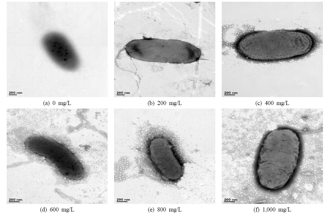 Fig. 4에는 TEM을 이용하여 칼슘이온 주입 농도에 따른 미생물의 표면 특성을 측정 200 nm 사이즈로 이미지화 하였다. 각 조건별 TEM 측정결과는 칼슘이온